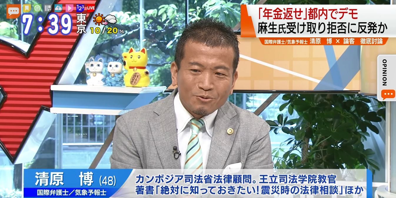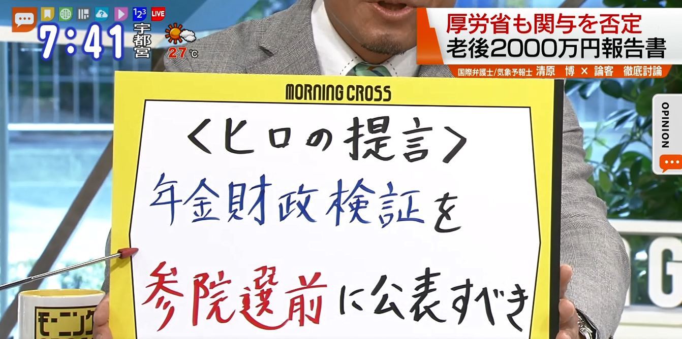 TOKYO MX(地上波9ch)朝のニュース生番組「モーニングCROSS」(毎週月~金曜7:00~)。6月17日(月)放送の「オピニオンCROSS neo」のコーナーでは、国際弁護士で気象予報士の清原博さんが年金の老後2,000万円問題について意見を述べました。