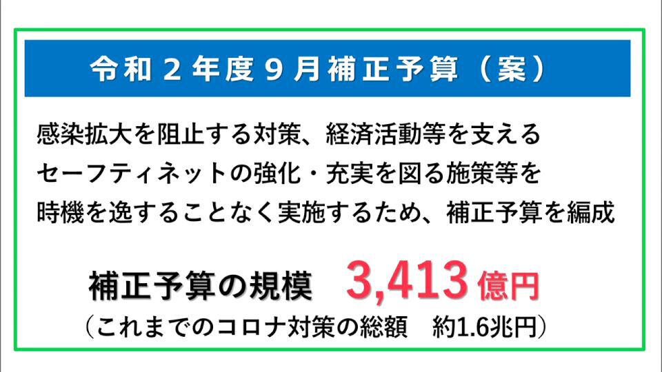 総額3,413億円の補正予算案の内訳は、高齢者などに対するインフルエンザ定期予防接種への特別補助などを新たに加えた「新型コロナウイルス感染拡大を阻止する対策」に882億円を計上。
