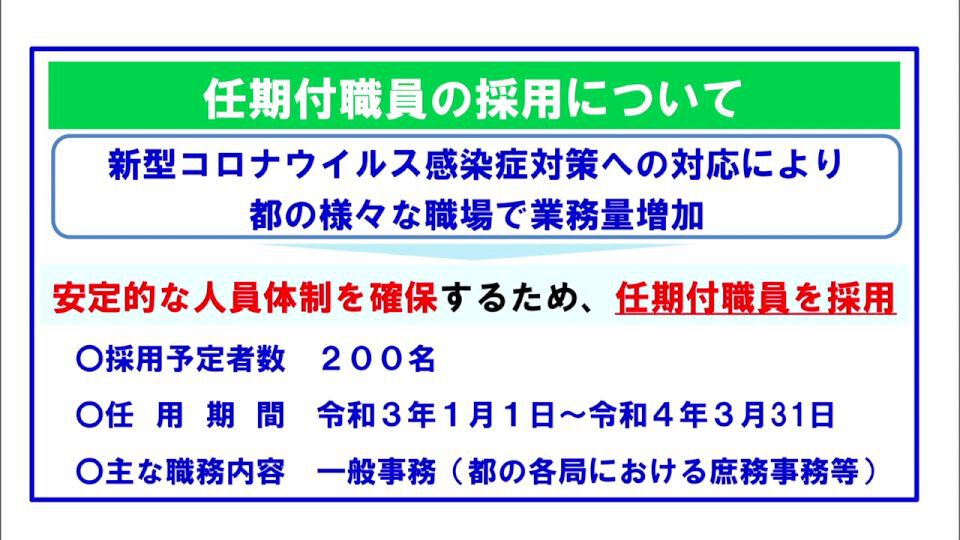 「都は今、新型コロナウイルス感染症対策へ人員を集中させています。そのことによって、結果として様々な職場で一人一人の業務量が増加しているということが生じ、引き続き、安定的な人員体制確保のため、任期付きの職員を採用するということです」
