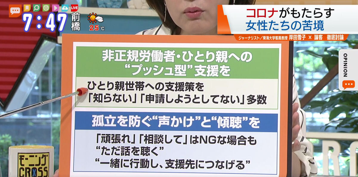 1つは「非正規労働者、特にひとり親の方々への“プッシュ型”支援」。すでに政府はひとり親世帯に対して5万円の追加支援を行っているそうですが、「まだ知らない方、申請しようと思っているものの、子どもがいて出向けない、申請している時間がないという声も非常に多い」と岸田さん。それだけに「お金を付けただけで終わりではなく、届くまでのフォローを喫緊の課題としてやっていただきたい」と主張します。