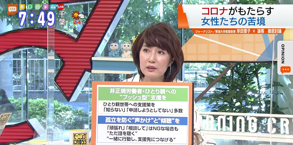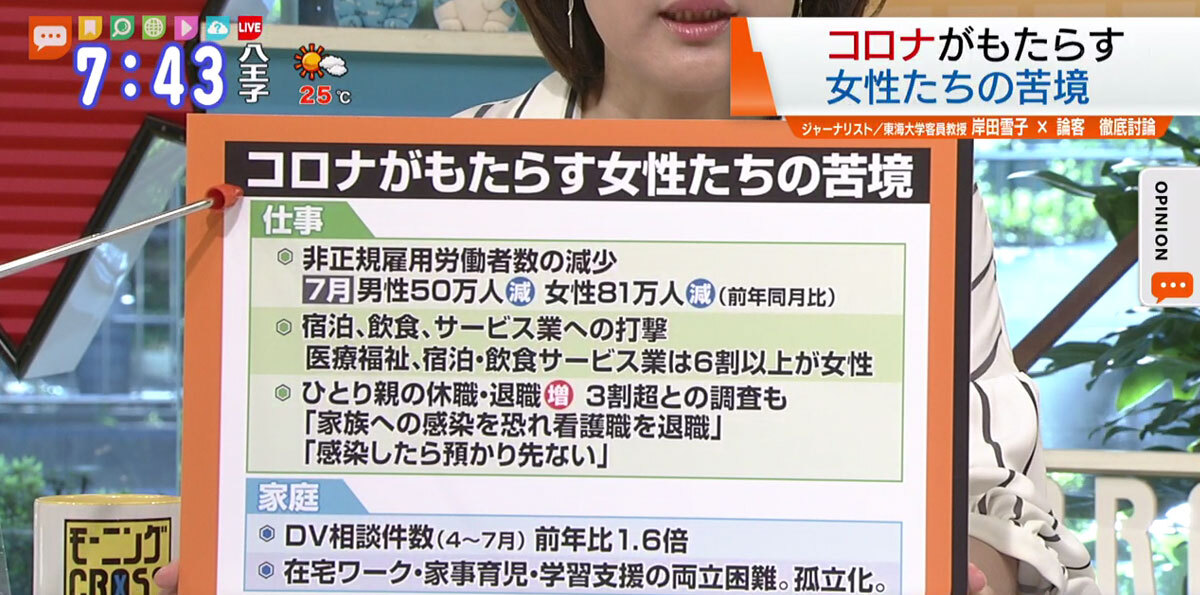 TOKYO MX(地上波9ch)朝のニュース生番組「モーニングCROSS」(毎週月~金曜7:00~)。9月30日(水)放送の「オピニオンCROSS neo」のコーナーでは、ジャーナリストで東海大学客員教授の岸田雪子さんが“コロナによる女性の苦境”を解説しました。