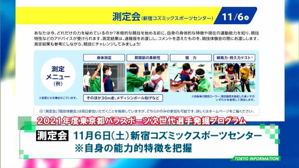 今回、募集のプログラムでは、11月6日(土)に新宿コズミックスポーツセンターで、自分自身の能力的特徴を把握する測定会が行われ、11月23日(火・祝)にBumB東京スポーツ文化館で、自分に合う競技を見つけるための競技体験や、専門家などによる競技を始めるためのアドバイスなどが受けられる競技相談が行われます。