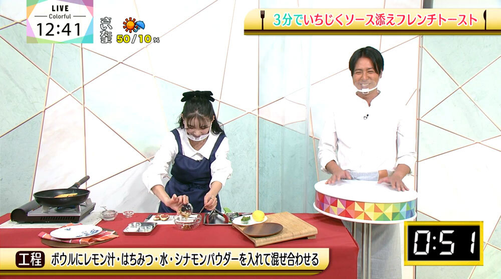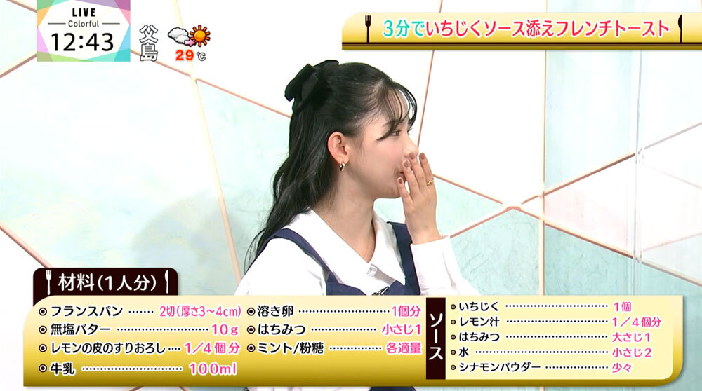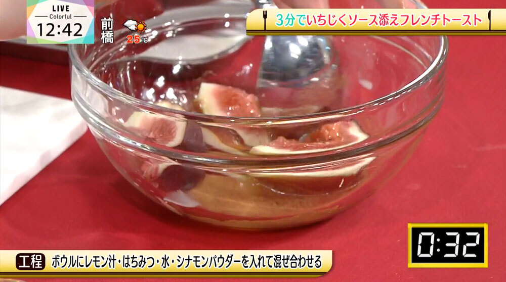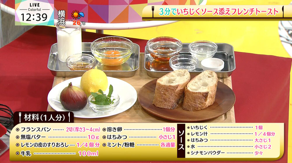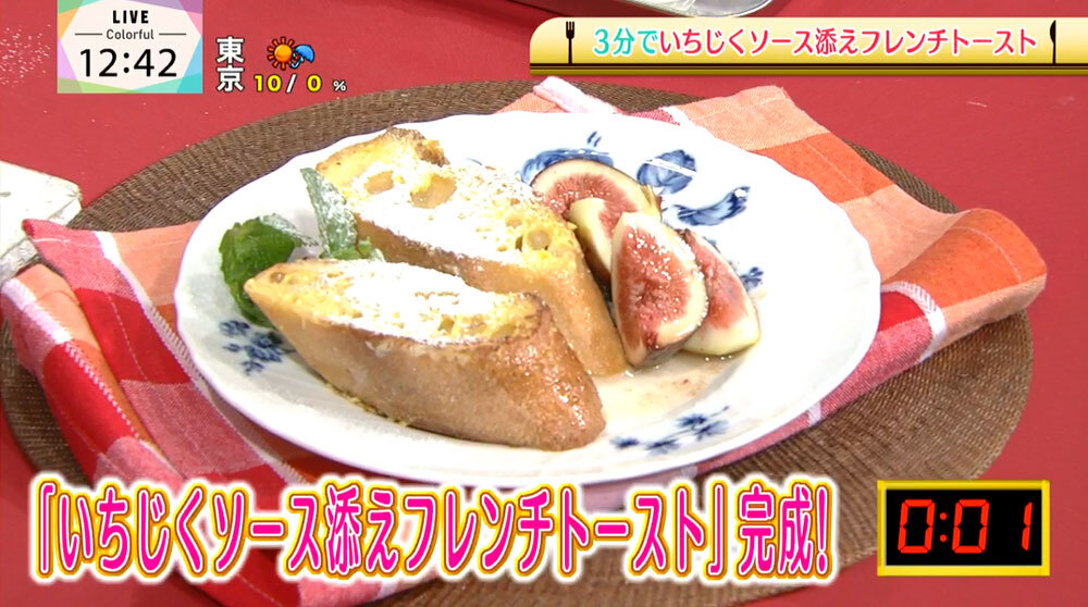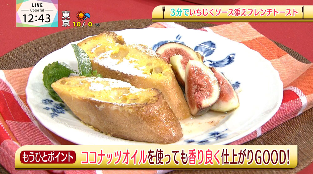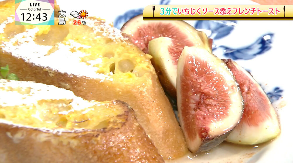 アン ミカがMCをつとめるTOKYO MX(地上波9ch)のバラエティ生番組「日曜はカラフル!!!」(毎週日曜11:55~)。10月10日(日)放送の「It's 少 time! カンタンカラフルクッキング」のコーナーでは、「いちじくソース添えフレンチトースト」を紹介しました。