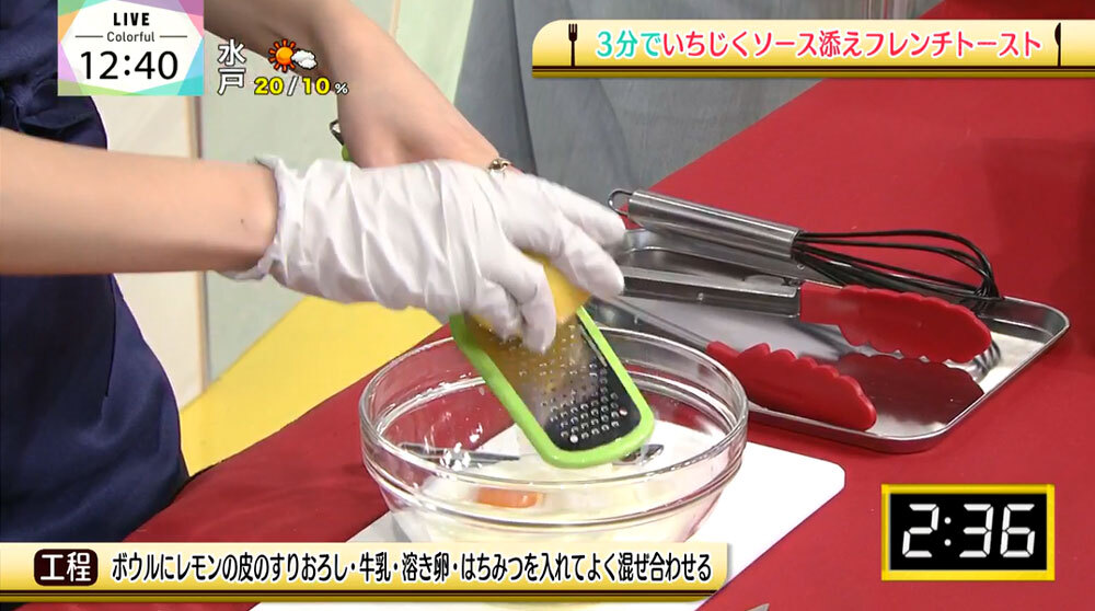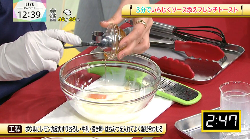 まずは生地作りから。ボウルに溶き卵と牛乳、はちみつ、さらにはレモンの皮のすりおろしを加え、よく混ぜ合わせます。