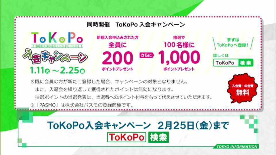 また、交通局では、ToKoPoの入会キャンペーンも、あわせて開催しているので、まだ入会されてない人は、この機会に入会して欲しいと呼びかけています。