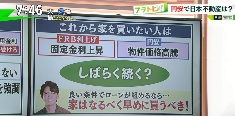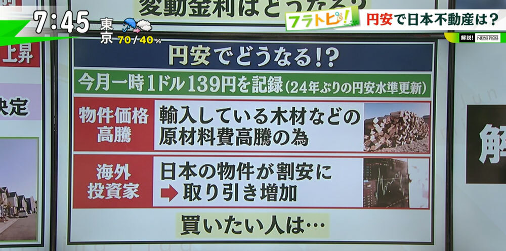 こうした状況からも「不動産を持っている人、売りたい人には嬉しいかもしれないが、買いたい人にとって円安はあまり良い状況ではない」と江口さん。