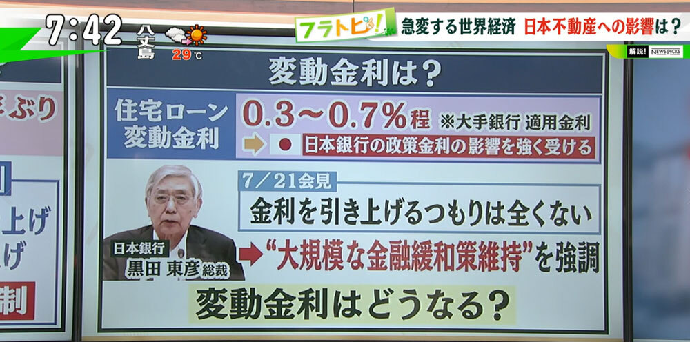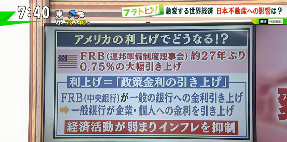 TOKYO MX(地上波9ch)朝の報道・情報生番組「堀潤モーニングFLAG」(毎週月~金曜7:00~)。「フラトピ!」のコーナーでは、世界経済が急変するなかで気になる今後の“日本の不動産事情”について解説しました。