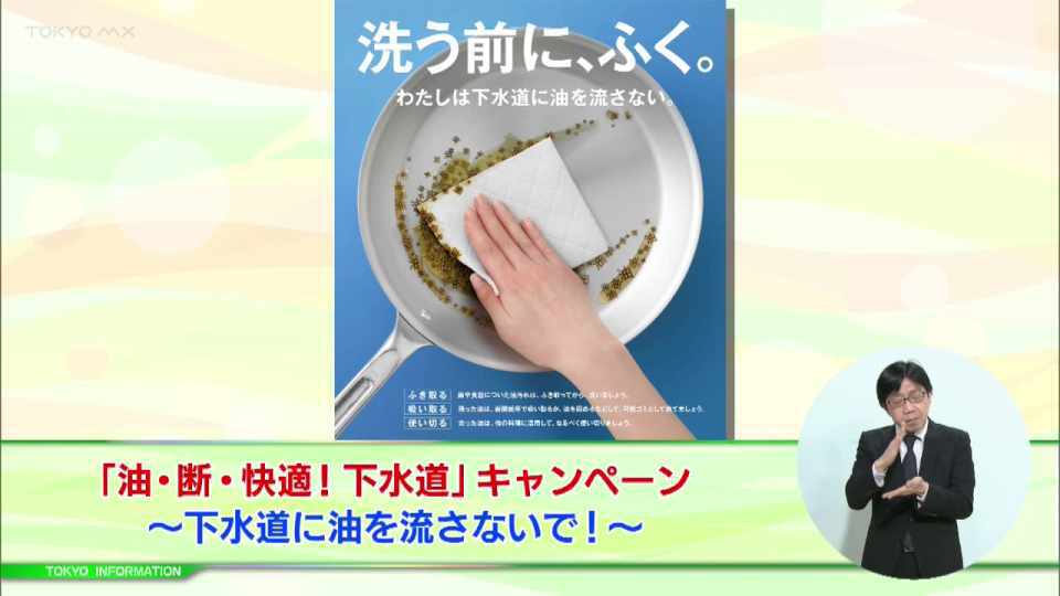 「油・断・快適!下水道」は、油を断って快適な下水道にするため、お皿や鍋を洗う前に油汚れをふき取るなどをお願いしているキャンペーンです。