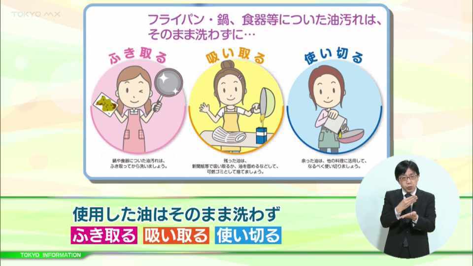 このため、降雨量が多く、気温が下がり始める10月を強化月間とし、お客さまや事業者に対し、「下水道に油を流さない」ように、台所などで油を使用した際には、そのまま洗わずに、「ふき取る」「吸い取る」「使い切る」ことをお願いしています。