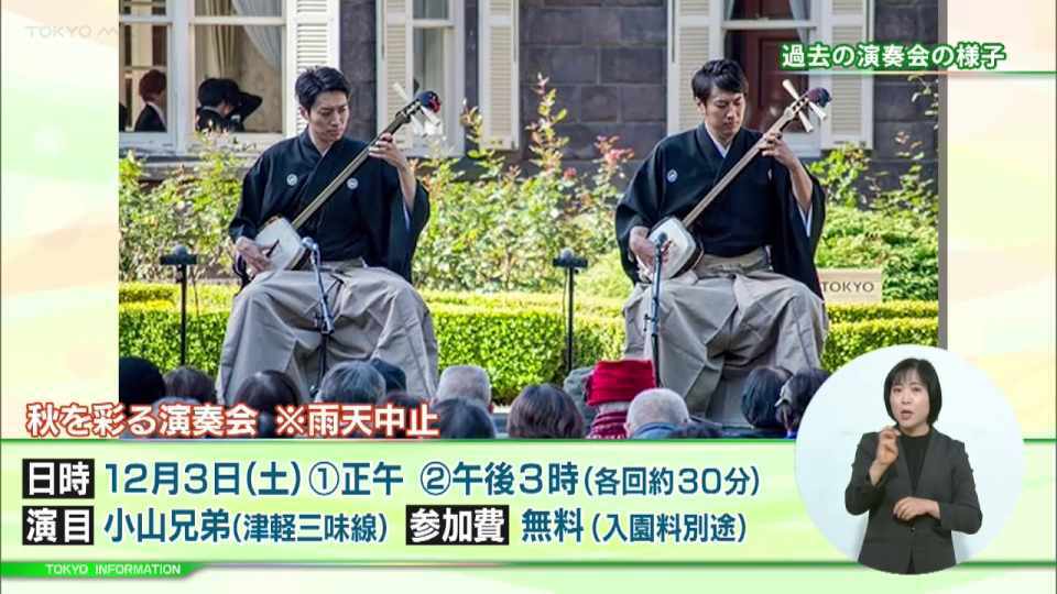 12月3日(土)正午と午後3時には、それぞれ約30分間、「秋を彩る演奏会」小山兄弟による津軽三味線が行われます。