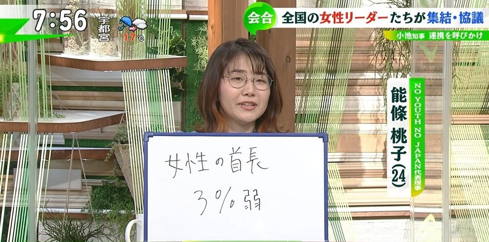 このニュースに対し、インスタメディア「NO YOUTH NO JAPAN」代表の能條桃子さんは、「女性の首長3%弱」と日本の現状を紹介。