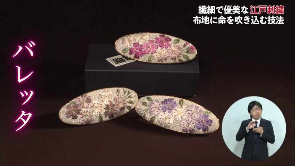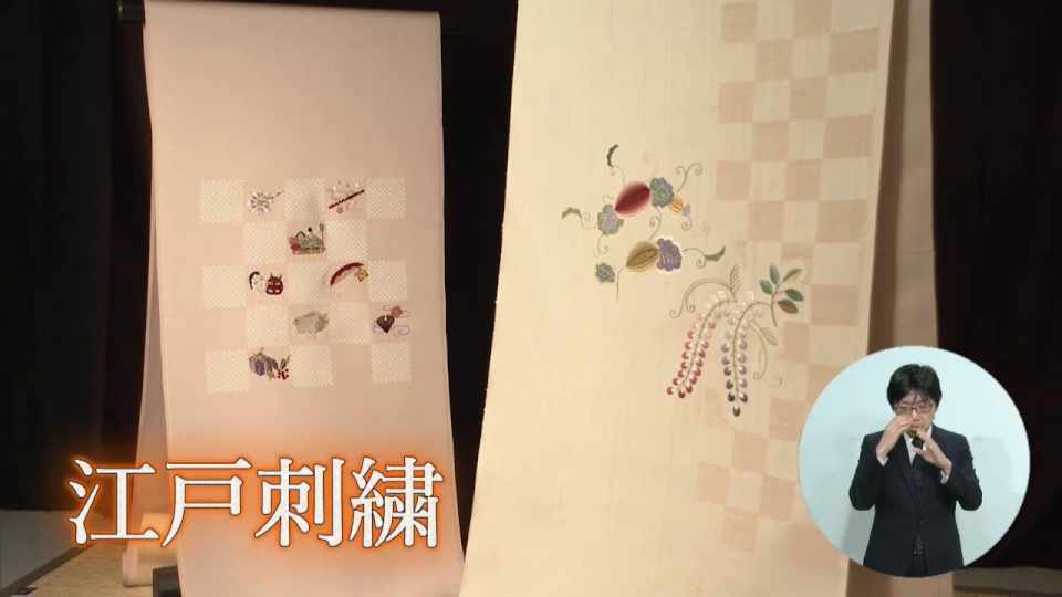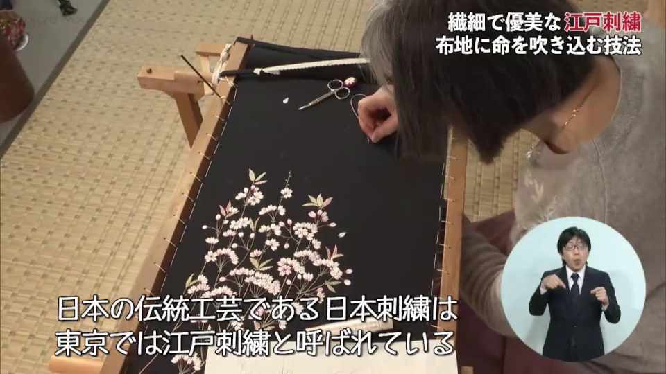 (江上芳子さん)「日本の伝統工芸でありる日本刺繍、東京では江戸刺繍と呼ばれています。糸で絵を描いているようなものです。自分で思ったことを表現できるところが良いと思いますね」
