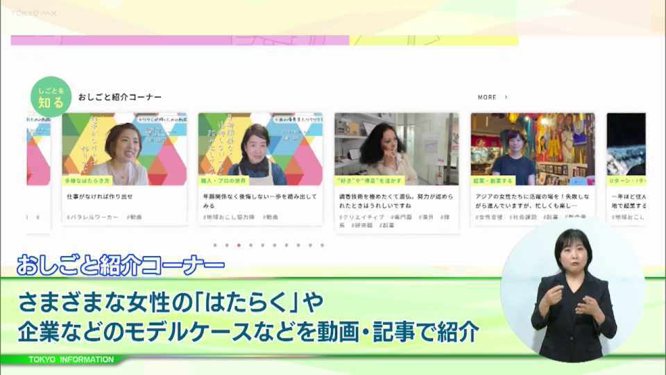 「おしごと紹介コーナー」は、女性の働く選択肢について、多様な働き方で活躍する女性や、活躍を後押しする企業などのモデルケースとなる「おしごと紹介」動画、記事などを紹介しています。