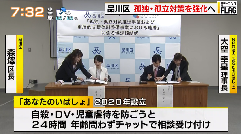 品川区は、孤独や孤立に苦しむ人の相談体制を強化しようとNPO法人「あなたのいばしょ」と協定を締結しました。2020年に設立された「あなたのいばしょ」は、自殺やDV、子どもの虐待を防ごうと毎日24時間、年齢を問わずチャットで相談を受け付け、これまで100万件以上の相談に対応しています。
