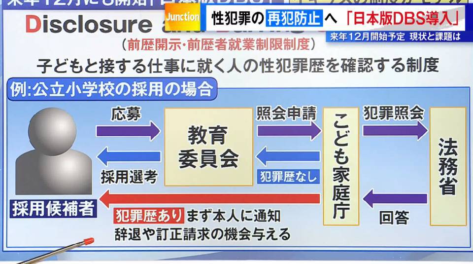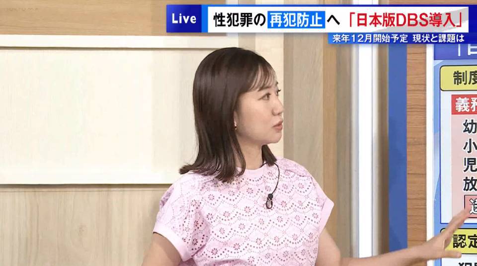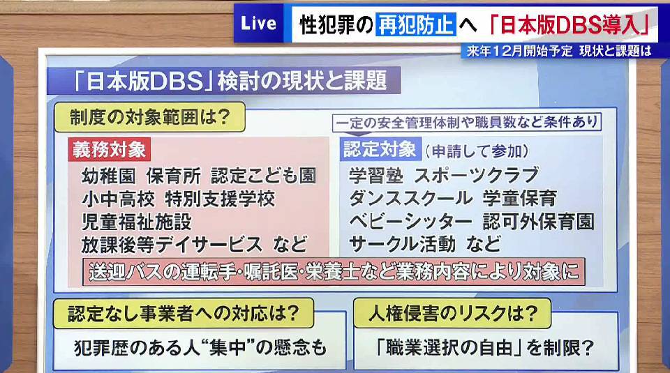 性犯罪に関して今、政府は“日本版DBS”の導入の検討を進めています。DBSとは“Disclosure and Barring Service(前歴開示・前歴者就業制限制度)”の略で、イギリスなどで導入されている制度です。それをモデルに、日本版の「子どもと接する仕事に就く人の性犯罪歴を確認する制度」として来年12月の導入を目指し、7月にはこども家庭庁が制度の素案を示しています。