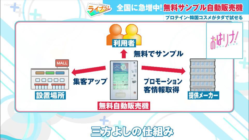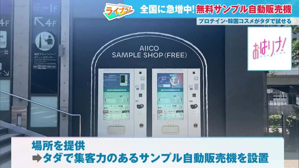 例えば、スカイツリーのある施設「東京ソラマチ」では韓国コスメがもらえる自動販売機が登場。去年までは50台ほどしかなかった無料自動販売機がいまや全国に300台以上あり、九州で7月から始まった女性向けカミソリの自動販売機も今後全国に広がっていく予定だそうです。