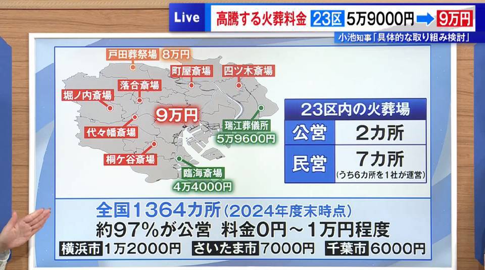 しかし、全国には1,363の葬儀場がある中、97%は公営で税金が使われており、無料から1万円程度のところがほとんど。例えば、横浜市は1万2,000円。さいたま市は7,000円、千葉市は6,000円です。