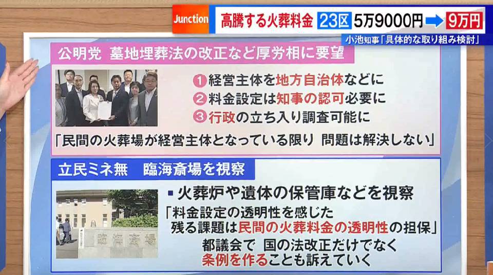 さらに、立憲民主党などが作る会派は、臨海斎場を視察。そこでは料金設定の透明性を感じたそうで、残る課題は民間の火葬料金の透明性の担保で、都議会で国の法改正だけではなく条例を作ることなども訴えていきたいとしています。