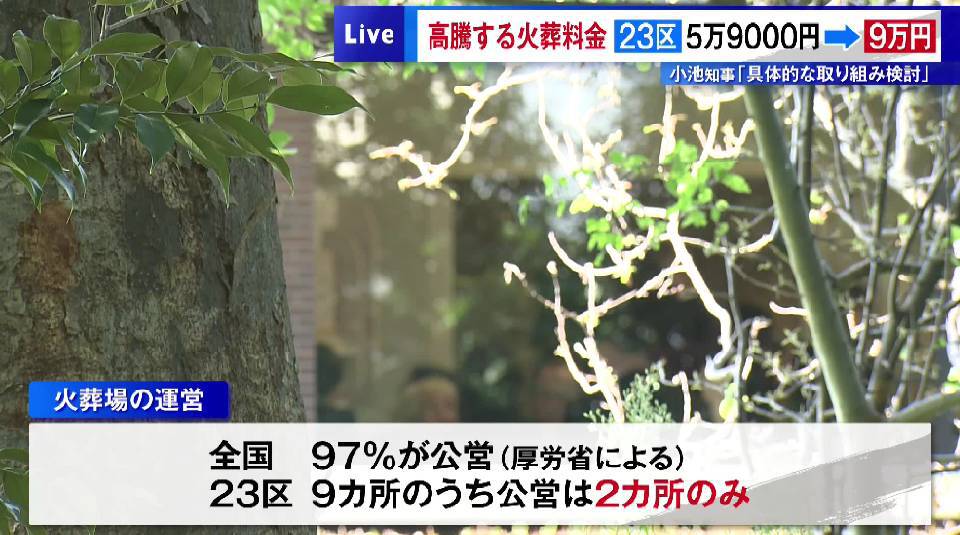 この問題の背景には、23区内に公営の葬儀場が少ないこともあります。全部で9ヵ所の葬儀場があるなか、公営は2ヵ所のみ。一方、全国で見ると料金を公費で負担する公営が97%。23区は民間の事業者が格段に多いことも火葬料金を押し上げるひとつの要因となっています。