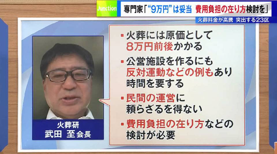また、火葬場の建設や運営サポートなどを行う団体「火葬研」の武田至会長に話を聞いてみると「火葬料金の原価は8万円前後かかる。それに対して自治体は、税金で補填しているので安い火葬料金・無料でできる。23区だけが日本全国で見ると特別」と言います。さらには「23区は民間がサービスを提供していたが、その負担が厳しいというのであれば公共サービスとして整備するか、例えば、その費用負担を行政が行うなど考えていかなければいけない」との指摘も。