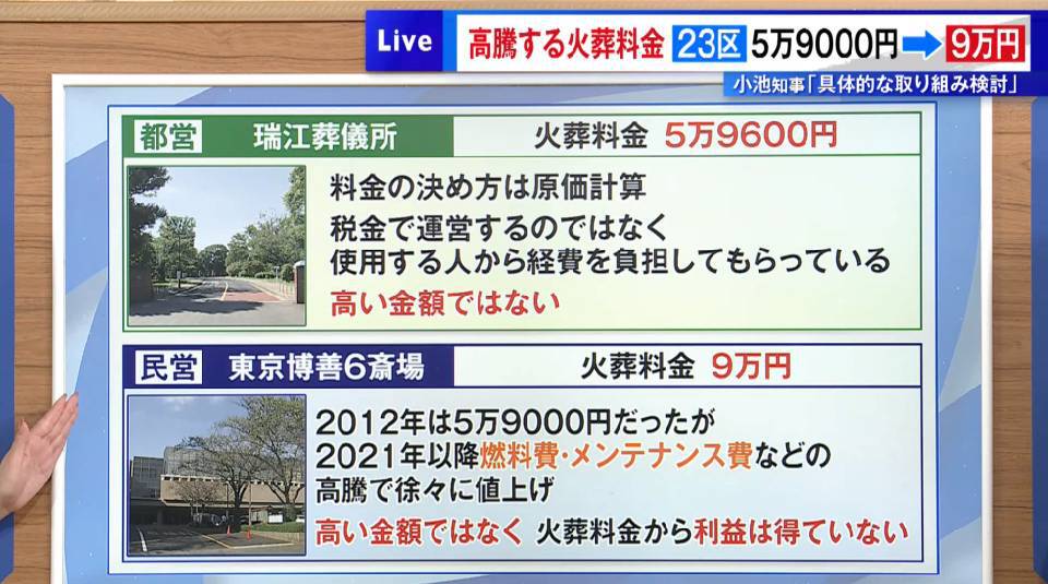 火葬料金について、東京都の担当者によると、東京都瑞江葬儀所は原価計算で料金を決めており、税金の運営ではなく利用者に経費を負担してもらっているとのことで、原価に基づいているので高い金額ではないとしています。一方、6ヵ所の葬儀場を運営する民営の東京博善は、2012年は5万9,000円だった料金を、燃料費などの高騰から2021年に10年ぶりに改定。その後も徐々に値上げし現在の9万円に至っていますが、火葬料金からは利益は得ていないと説明しています。