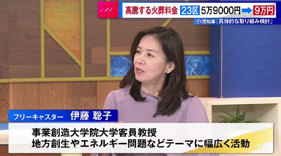 この状況に対し、フリーキャスターの伊藤聡子さんは「誰もが必ず死ぬわけですから、火葬場はインフラ。そう考えると、(火葬料金は)税金のなかに組み込まれていてもいいと思う。それに、民間に任せてこんなに格差があるのはおかしい」と率直な思いを吐露。