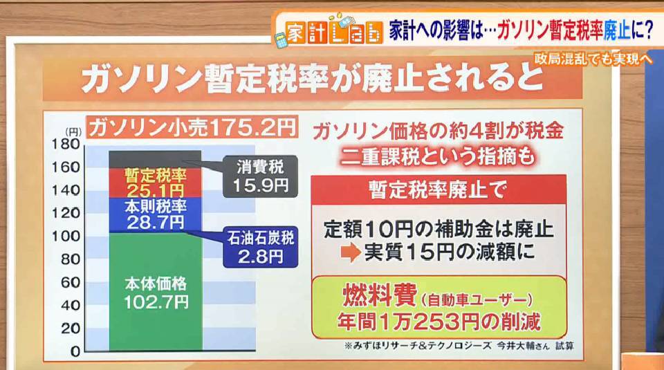 もしガソリン暫定税率が廃止されると、ガソリン価格に対して現在政府が支給している1L当たり10円の補助金も廃止となるため、実質15円の減額となります。みずほリサーチ&テクノロジーズ・今井大輔さんの試算によると、暫定税率の廃止によって、自動車を所有する家庭の燃料費の年間支出が10,253円削減できると見られています。