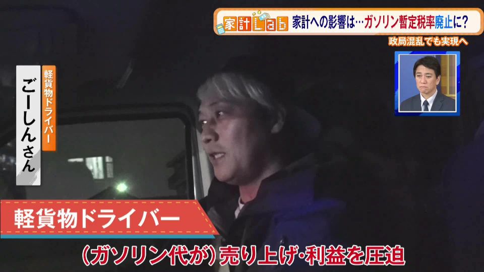 ガソリン暫定税率廃止の影響は、クルマに乗る人だけではありません。そこで番組は、フードデリバリーや通販サイトの荷物を軽ワゴン車で運んでいるフリーランスの軽貨物ドライバー・ごーしんさんを取材しました。