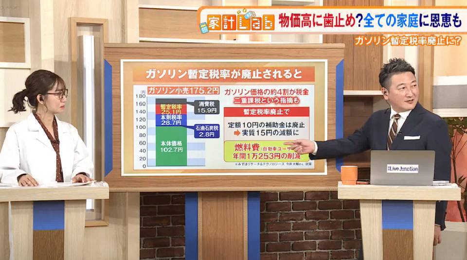 TOKYO MX(地上波9ch)の報道・情報生番組「堀潤 Live Junction」(毎週月~金曜20:00~)。家計に関するお金のニュースを深掘りする「豊崎由里絵の家計Lab」のコーナーでは、“ガソリン暫定税率”が廃止となった場合に及ぼす家計への影響について取り上げました。