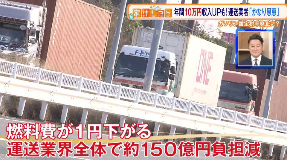 実際、燃料価格が1円下がると、運送業界全体で約150億円もの負担が減るとの試算も。そして、ガソリン暫定税率廃止の恩恵は、クルマを所有する人や運送業だけでなく、クルマを所有していない家庭にも及びます。