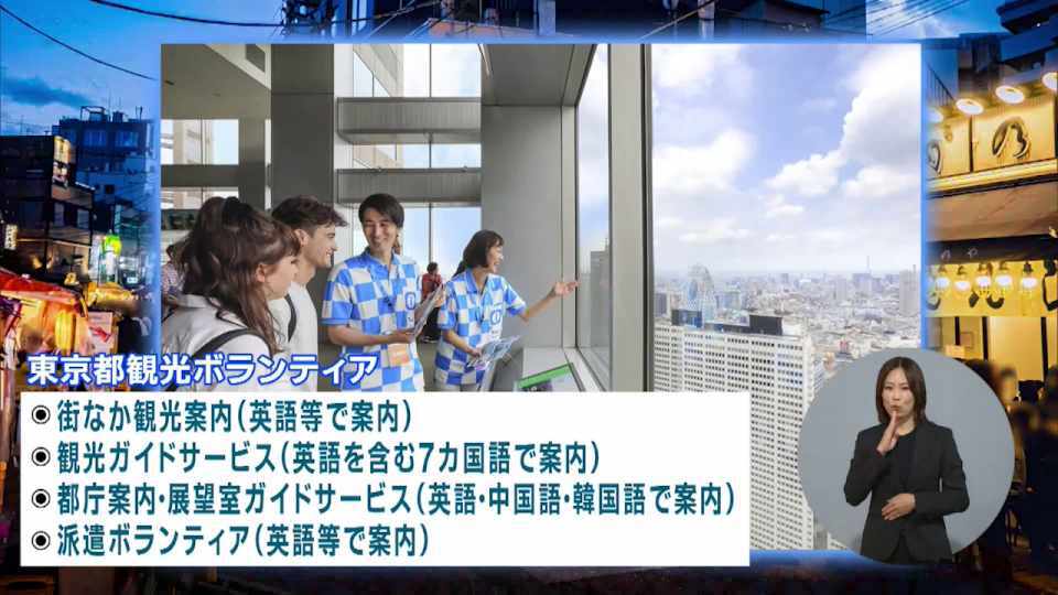 英語などによる「街なか観光案内」や、多言語による「観光ガイドサービス」、英語や中国語、韓国語による「都庁案内・展望室ガイドサービス」、英語などの「派遣ボランティア」を行います。