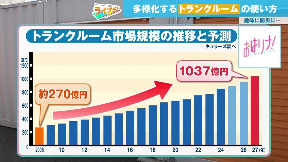このようにトランクルームの活用方法が年々多様化すると同時に、その市場規模も拡大。2008年は270億円ほどでしたが、2027年には1,000億円を突破する見込みです。トランクルームを運営しているエリアリンクの椿さんは「最近は住宅価格が非常に上がっていたりしてなかなか引っ越せない。(トランクルームは)単なる箱ではあるが、使い方は無限大。いろいろな使い方でどんどん拡大していくと思う」と今後の展望を語ります。