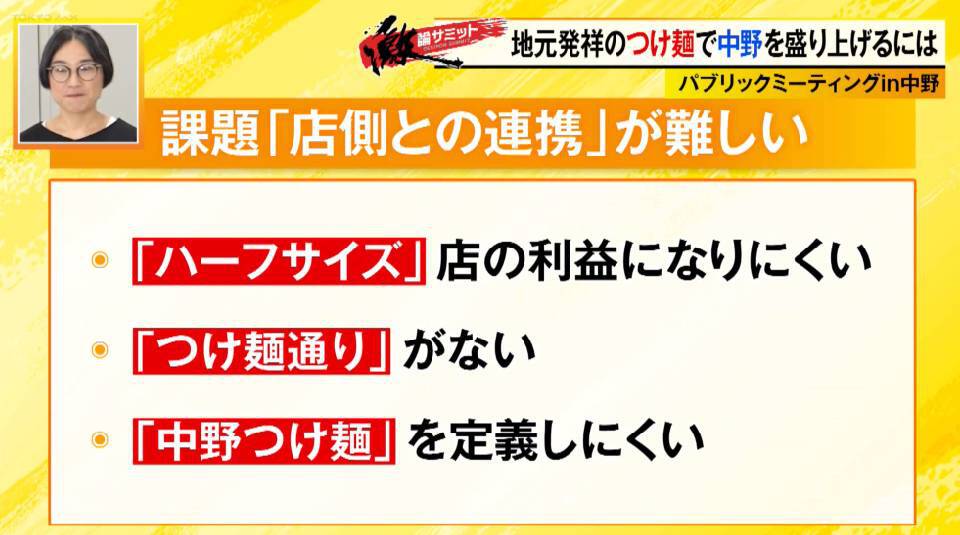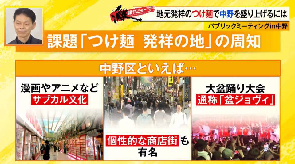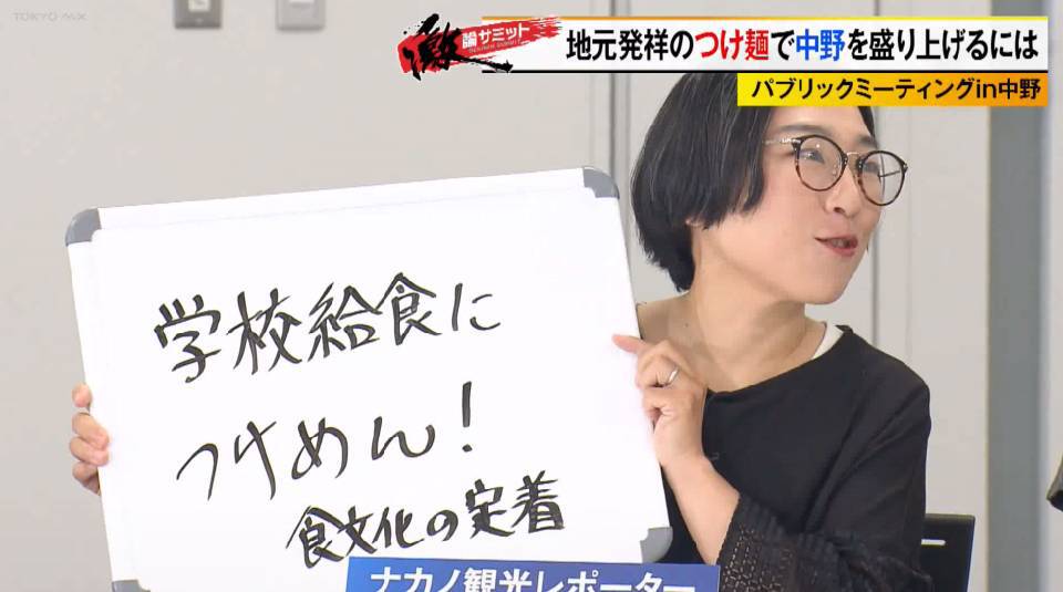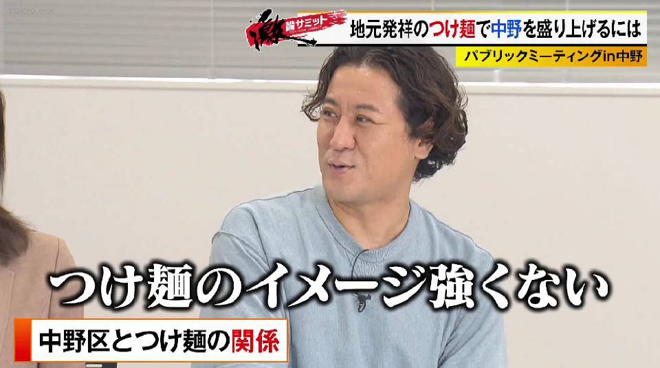 そんな現状に、ヨッピーさんが「(中野の)サブカル文化や商店街、盆ジョヴィも他の地域に比べ抜きん出ている。つけ麺も抜きん出る武器、発祥の地だけではなく何かがほしい」と改善点を指摘すると、フリーキャスターの伊藤聡子さんは「中野はとにかくちょっと尖ってる、そして多様な個性がすごくあるのが特徴。つけ麺にもその精神がどこか入った何かが欲しい」といい、ちいたんさんも「お笑い芸人さんも中野にはいたりするので、ギャグとか作ってもらいたい」と提案します。