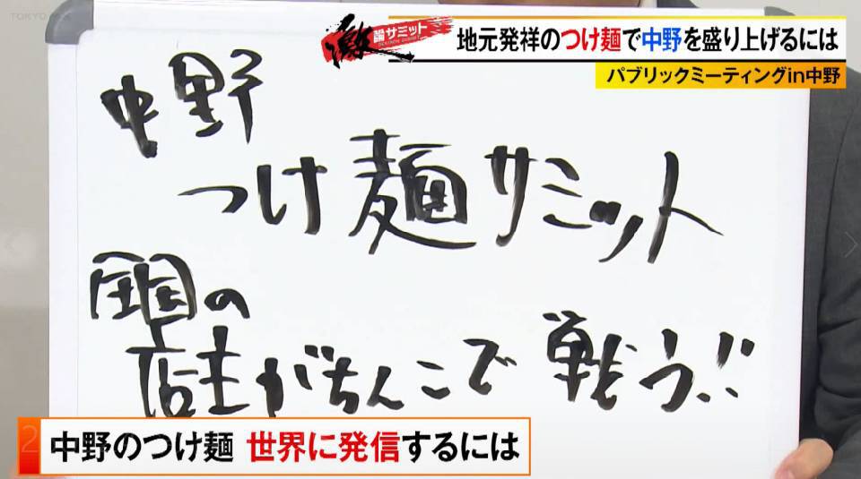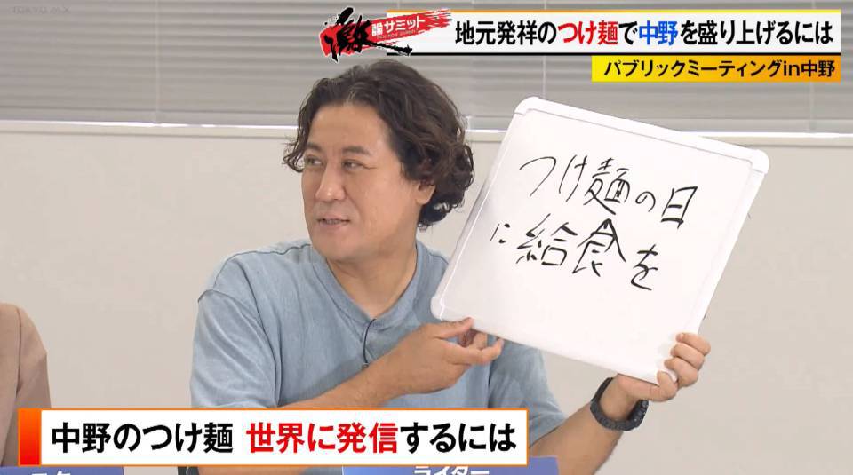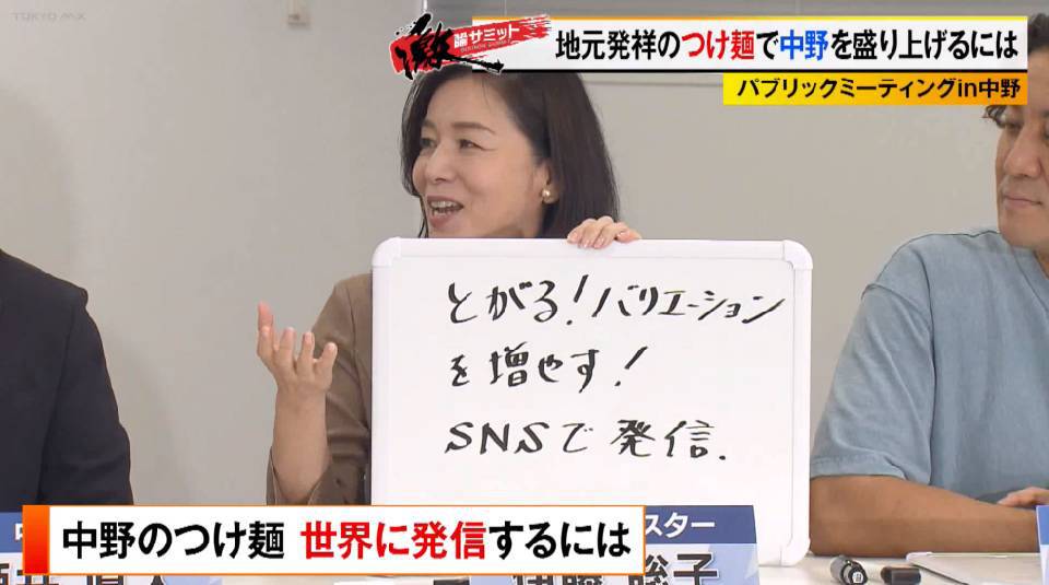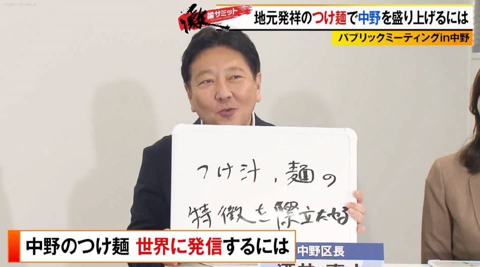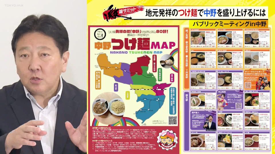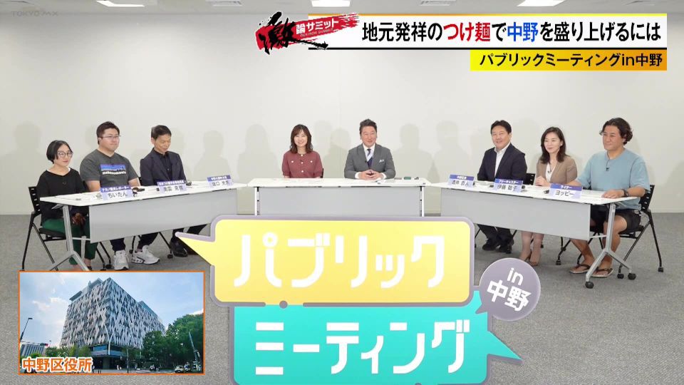 TOKYO MX(地上波9ch)の報道・情報生番組「堀潤激論サミット」(毎週金曜21:00~)。番組では「パブリックミーティングin中野」と題して、中野区発祥のつけ麺をいかに世界に発信するかを番組コメンテーターに加え、中野区の酒井直人区長や同区民代表、さらには人気つけ麺店の店主などを交えて議論しました。