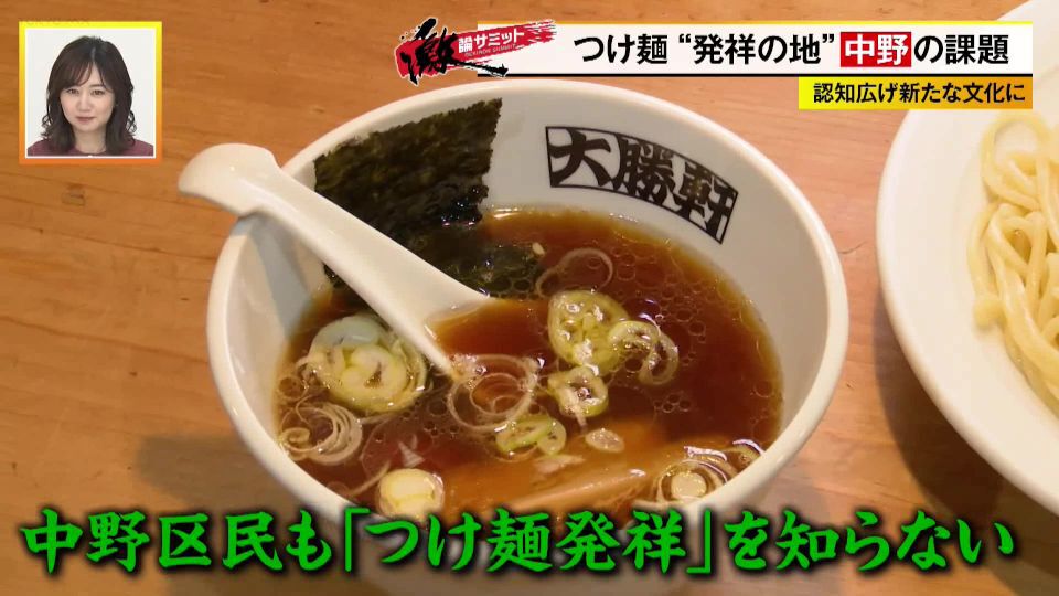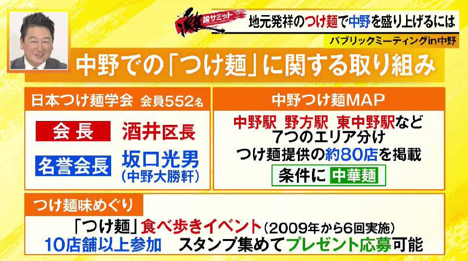 そこで番組では、中野区役所にて「パブリックミーティングin中野」を開催。参加者は、中野区・酒井区長と中野大勝軒の現大将・坂口さん、そして日本つけ麺学会事務局長の南雲克雅さん、ナカノ観光レポーターのちいたんさん、中野在住8年のライター・ヨッピーさん、フリーキャスターの伊藤聡子さん。この6人を交えて、中野発祥のつけ麺の認知を広め、盛り上げるために必要なことについて徹底議論します。