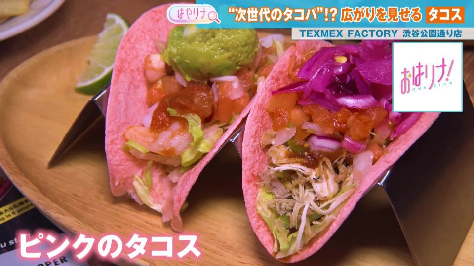 続いて、東京・渋谷にある「TEXMEX FACTORY 渋谷公園通り店」のタコスは、ピンクのトルティーヤがSNS映えすると人気を博しています。