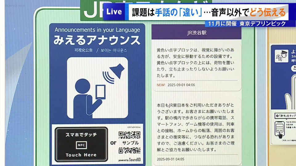 そうしたこともあり、都内の鉄道会社が急ピッチで進めているのが、文字化・多言語化の取り組みです。JR東日本などでは、二次元コードを読み取ると駅で流れている音声アナウンスが、スマートフォンで文字で読める仕組みを導入。8月から試験的に5つの駅で導入されています。