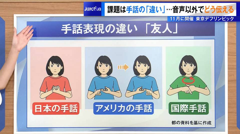 「東京2025デフリンピック」の会期中は海外から多くの選手団が来日しますが、そこには大きな課題があります。それは“手話の違い”です。手話は音声言語同様、基本的に国ごとに異なります。