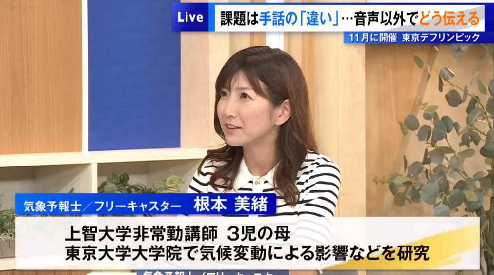 気象予報士でフリーキャスターの根本美緒さんも共感しつつ「今はAIでいろいろ便利になり、聴覚障害がある方も何かしら(文字入力できる機械などを)持っていて、それを私たちに見せてくるかもしれない。そういうときにこっちがちゃんと受け入れる体制、みんながその心づもりでいることが大事だと思う」とも。