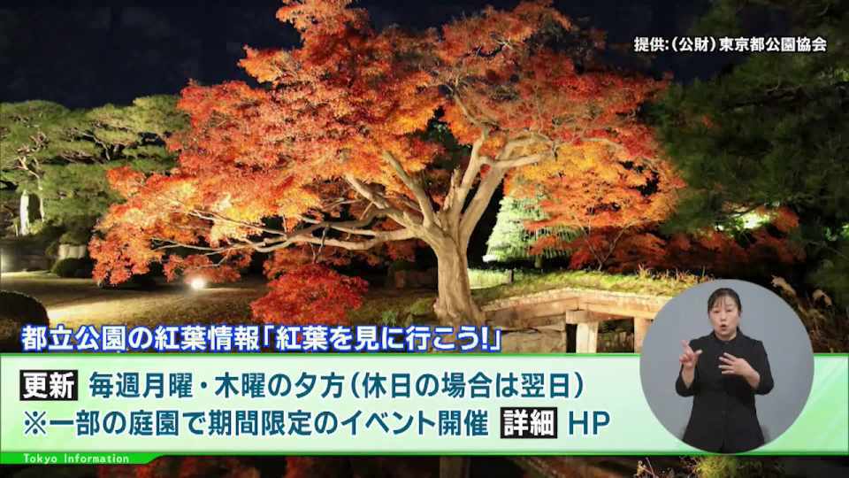 今回は小石川後楽園や水元公園など37公園・庭園の樹木の葉の色づき具合の情報提供する東京都の都立公園紅葉情報サイトや、2028年に東京で初めて開催される「ねんりんピック」とそのキャッチコピー募集を紹介しました。
