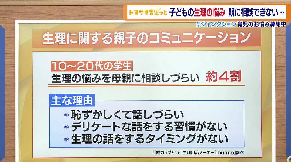 TOKYO MX(地上波9ch)の報道・情報生番組「堀潤 Live Junction」(毎週月~金曜20:00~)。育児の悩みを解決に導く「トヨサキ育児っと」のコーナーでは、子どもの“生理の悩み”を取り上げました。