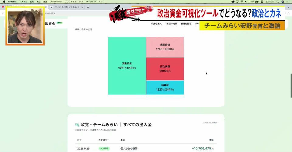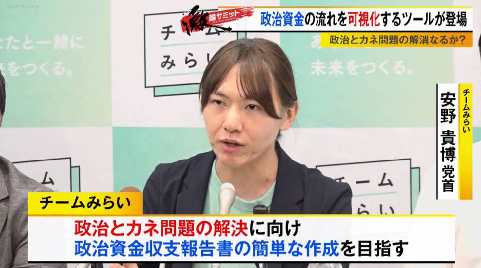 チームみらいの安野党首は10月2日、政治資金を可視化するツール「みらいまる見え政治資金」を発表。これを、政治とカネ問題の解決に近づく1歩目と位置づけており、今後も改良を重ね、政治資金収支報告書を簡単に作成できるようにしていく考えを示しています。