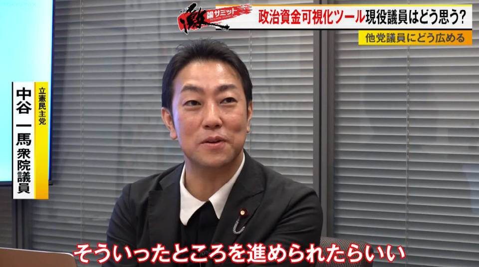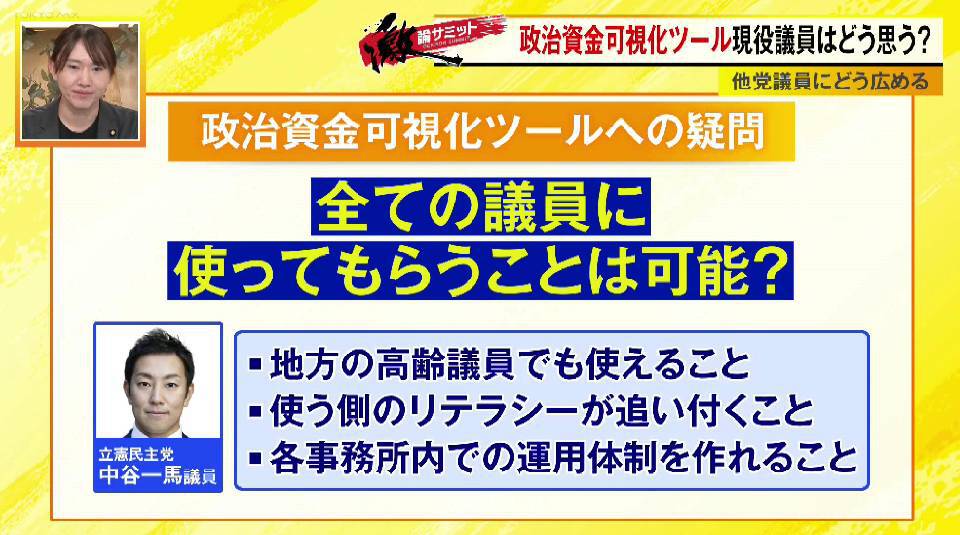 取材したキャスターの田中陽南が、このツールを導入することでこれまでの収支報告書と何が変わるのか尋ねると、中谷議員は「(政治資金が可視化できるので)ダイレクトに国民の皆さんに対して、スピーディーに私たちが何をしているのかを報告できる環境が整う。全党の議員がまず率先して始めたら、国民の皆さんから信頼していただける環境が作れるのではないか」と期待を寄せます。