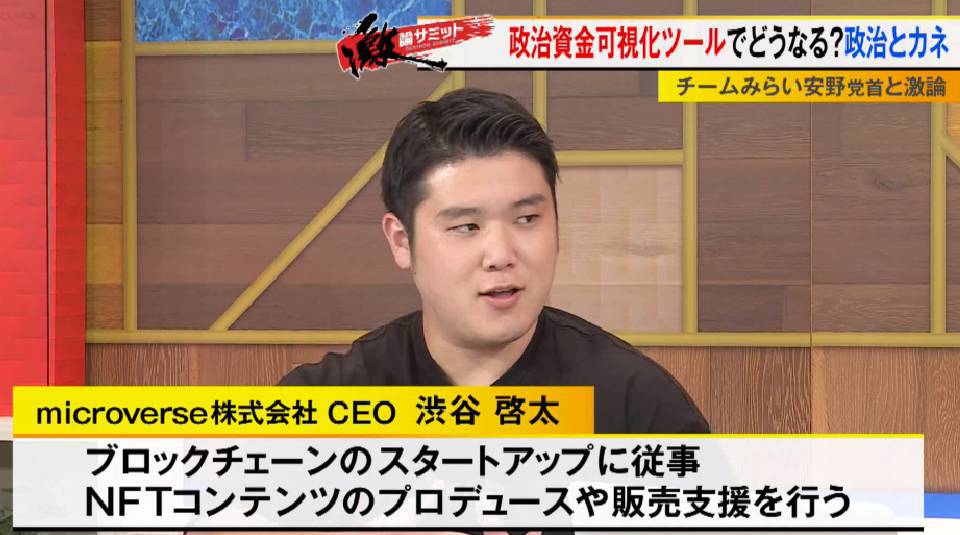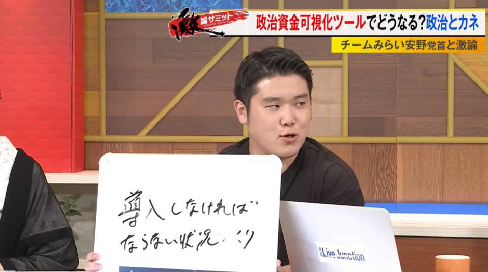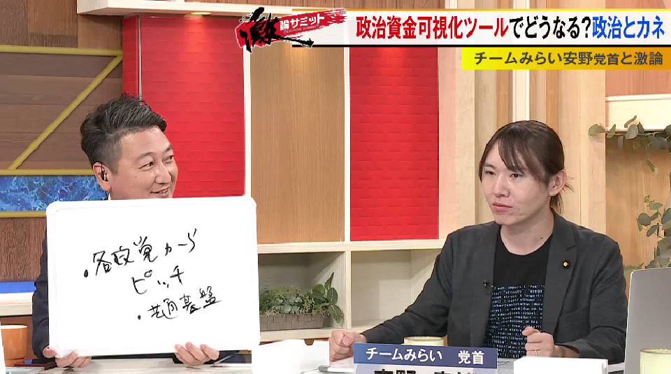 TOKYO MX(地上波9ch)の報道・情報生番組「堀潤激論サミット」(毎週金曜21:00~)。放送では「チームみらい」党首の安野貴博さんを迎えて、“政治資金透明化に向けた取り組み”について伺うとともに、政治とカネの問題について議論しました。