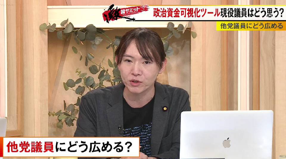 谷本さんは、「みらいまる見え政治資金」のような可視化ツールが開発されたことを機に「(議員の方々も)AIを使ったり、デジタルやガジェットを使ったりして、ご自身たちの政策をより良い形で発展できるような使い方も、併せて学んでいただければ」と求めます。