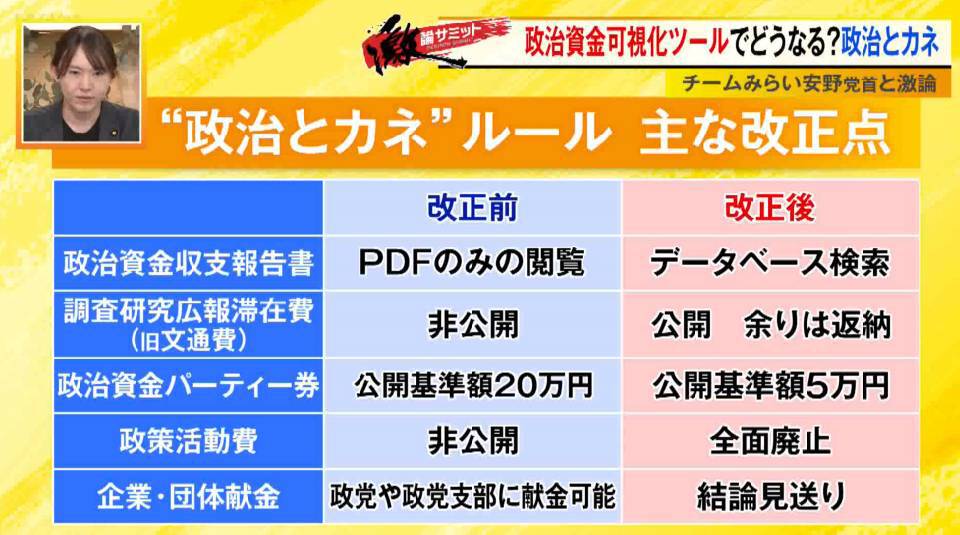ちなみに、昨年の法改正によって“政治とカネ”のルールはどのようになったのかというと、政治資金収支報告書については、PDFをネットで閲覧するのみからデータベース化され、検索が可能に。調査研究広報滞在費(旧:文通費)は、非公開から公開となり、余りは返納することになっています。政治資金パーティー券は、公開基準額を20万円超から5万円超に下げ、使い道が非公開だった政策活動費は全面廃止に。なお、企業・団体献金の是非については、未だに結論が出ていません。