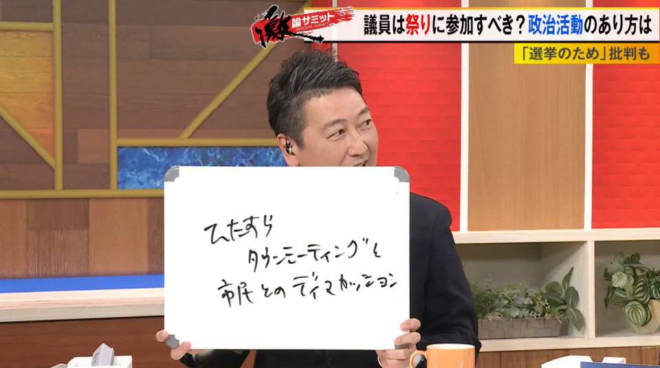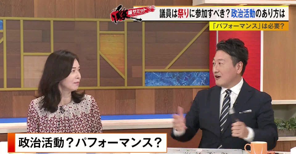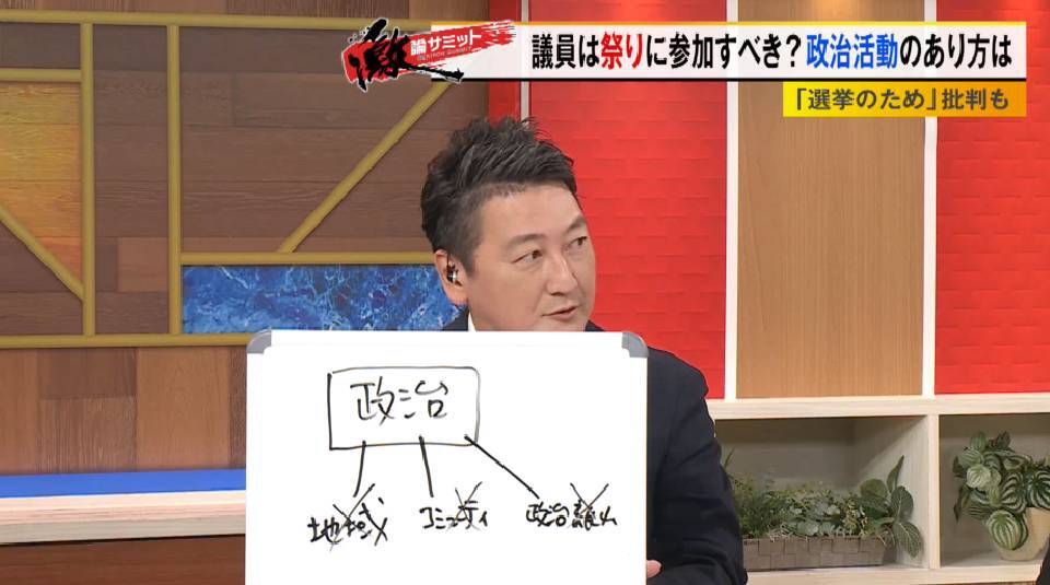 TOKYO MX(地上波9ch)の報道・情報生番組「堀潤激論サミット」(毎週金曜21:00~)。放送では、国会議員は地域のお祭りに参加すべきかどうか、政治活動のあり方について議論しました。