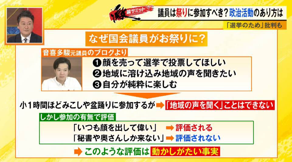 キャスターの堀潤は、地域と繋がる意味でのお祭りの重要性を理解しつつも「今はそこで関係を築いても、まとまった票に繋がらないぐらい地域そのものが弱体化していたり、団体やコミュニティなどが分散している。これは課題」と危惧します。
