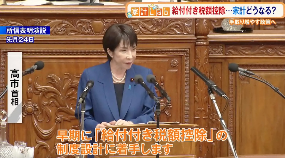 高市総理は10月の所信表明演説で、「税や社会保険料で苦しむ低所得者・中所得者層の負担を軽減し、所得に応じて手取りが増えるようにしなければならない」とし、給付付き税額控除の推進を表明しました。