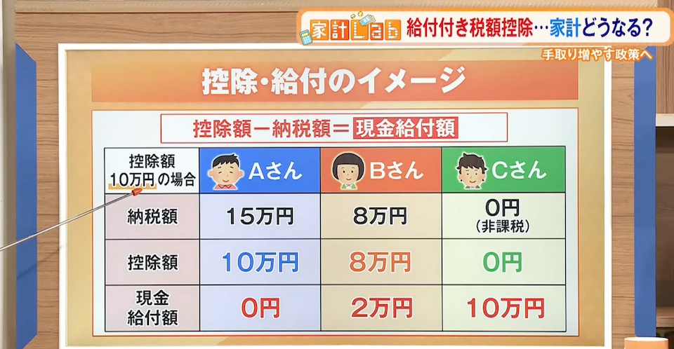 例えば控除額10万円の場合、納税額が15万円のAさんは控除額10万円を超えているので現金給付は0円。一方、納税額8万円のBさんには、控除額10万円との差額分、2万円が現金給付の対象となります。そして、非課税で納税額0円のCさんは、控除額10万円全額が現金給付額となります。